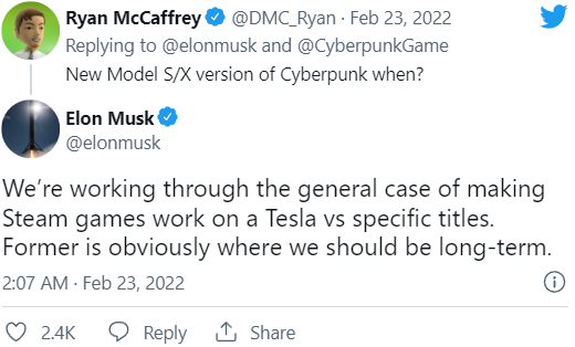 Илон Маск заявил, что в настоящее время ведутся разработки, направленные на то, чтобы библиотека игр Steam для ПК работала в автомобилях Tesla. В своем твиттер-ответе официальному аккаунту CD Projekt Red и Райану Маккефри из IGN Маск сказал, что Tesla работает над тем, чтобы сделать игры Steam доступными для владельцев автомобилей в целом, а не просто поддерживать разовые игры. Этот уровень поддержки почти соответствует обещанию Steam Deck — другими словами, если какая-либо конкретная игра Steam не поддерживается, это будет считаться ошибкой.