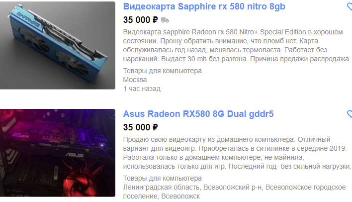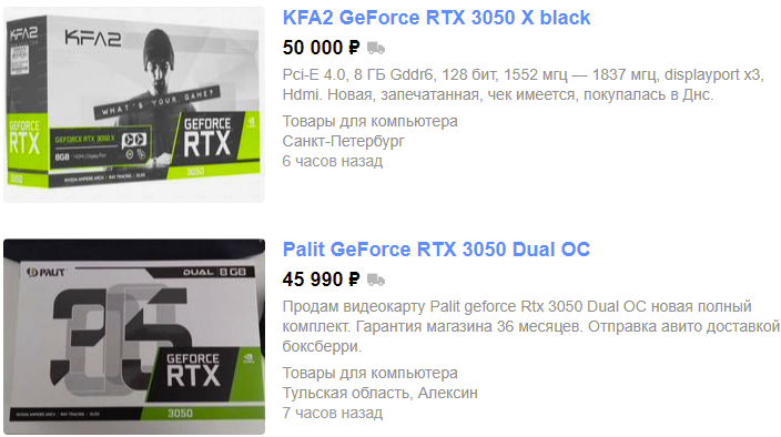 Ну а теперь по ценам. Как видите, перекупщики предлагают новые GeForce RTX 3050 за 50 000 рублей. Найти дешевле крайне сложно, поэтому остановимся на том, что цена именно такая. В крупных городах вы можете получить товар с гарантией от известной сети магазинов. Radeon RX 580 стоит 35 000 рублей и выглядит весьма сомнительно. Представьте себе, что вам нужна видеокарта, но тратить на неё больше 50 000 вы не хотите. Если вы остановитесь на абсолютно новой GeForce RTX 3050, то получите отличную производительность и снизите риски до нуля, ведь видеокарта на гарантии. А вот заплатив 35 000 и сэкономив 15 тысяч вы попадаете в опасное положение. Вполне возможно, что купленная вами Radeon RX 580 последние 4 года работала на ферме без остановок, а значит может быть в ужасном состоянии. Этот момент стоит учитывать во время финального выбора.