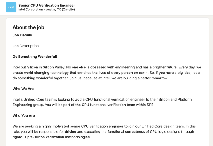 Intel опубликовала вакансию по поиску старшего инженера-верификатора (Senior CPU Verification Engineer) в команду Intel Unified Core, сообщает VideoCardz со ссылкой на объявление, размещённое на платформе LinkedIn (заблокирована в РФ).