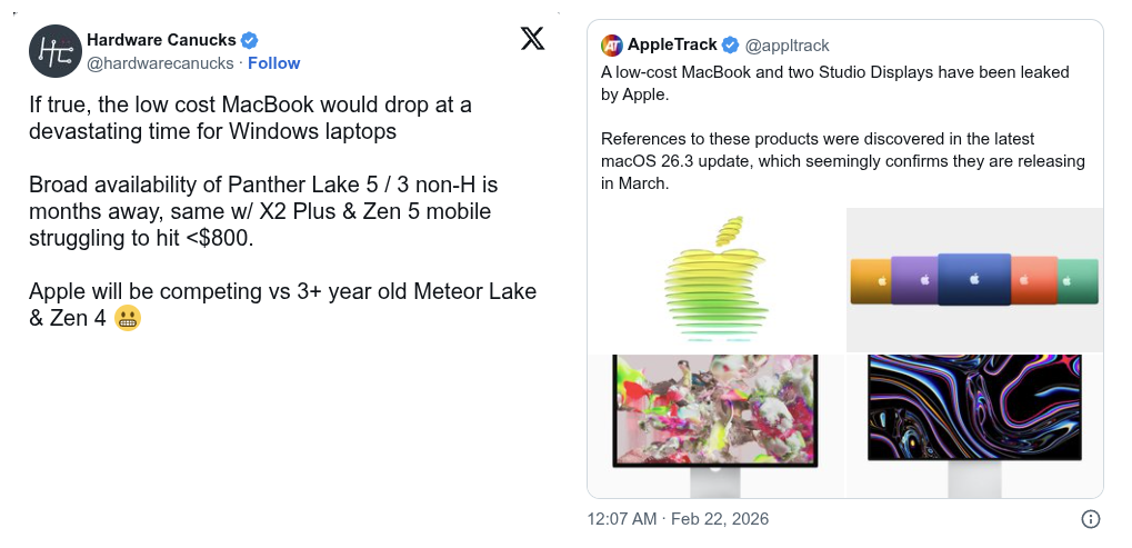 Во-вторых, бюджетные ноутбуки с Windows в основном полагаются на устаревающие компоненты, а распространение более производительных моделей с процессорами Core 3 и 5 на базе Panther Lake займет несколько месяцев. Пока это происходит, MacBook могут оттянуть на себя внимание пользователей, благодаря современному энергоэффективному железу и возможности присоединиться к экосистеме Apple.