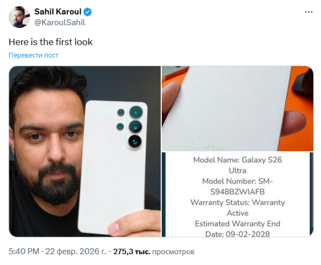 Samsung Galaxy S26 Ultra уже продается неофициально в Дубае, хотя его официальный запуск еще не состоялся. По крайней мере, так утверждает пользователь платформы X Карул Сахил (Sahil Karoul), который, по его словам, смог купить устройство.