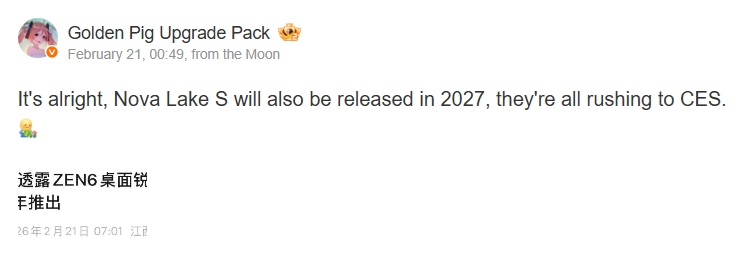 Вокруг сроков выхода новых процессоров Intel возникла неразбериха. Гендиректор компании Лип-Бу Тан (Lip-Bu Tan) ранее заявлял, что Nova Lake появятся в конце 2026 года. Но инсайдер Golden Pig Upgrade утверждает обратное. По его информации, полноценный запуск Nova Lake-S намечен на CES 2027.
