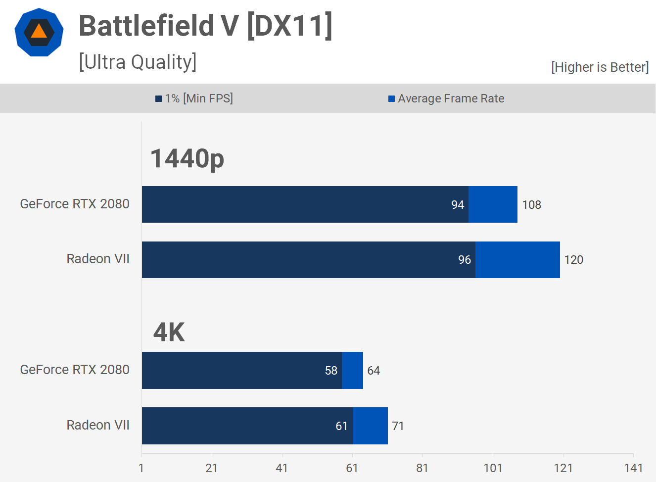 Одна из игр, где Radeon VII обходит RTX 2080 - это Battlefield V. Само собой DXR выключен. Здесь Radeon GPU был на 11% быстрее в обоих протестированных разрешениях.