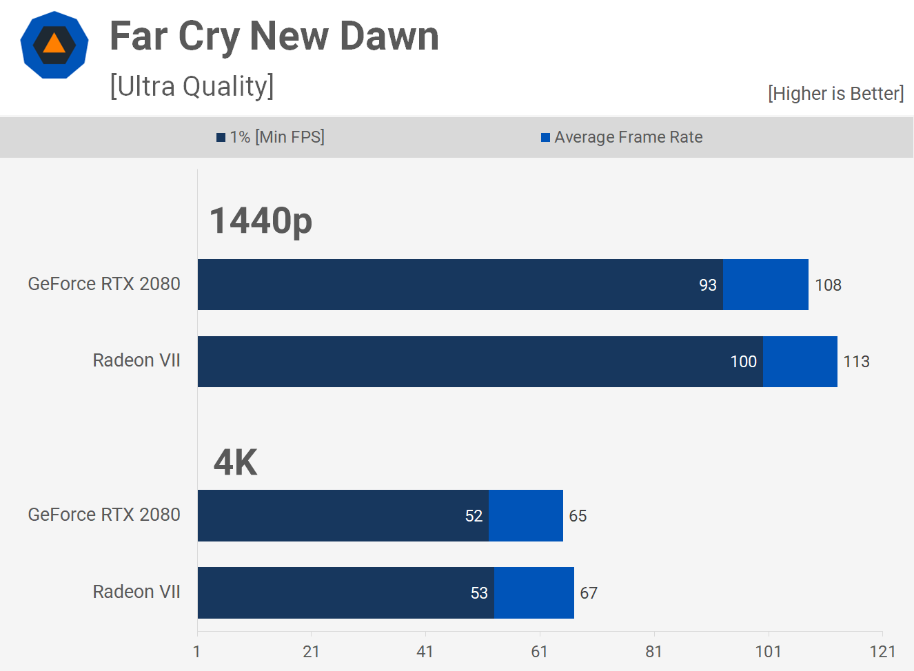 Radeon VII также удается одержать победу в Far Cry New Dawn, обойдя RTX 2080 с небольшим перевесом в обоих разрешениях.