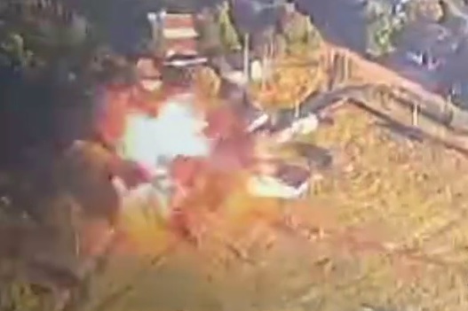 Скриншот из видео, на котором запечатлены сразу два ДПЛА: вверху российский охотник, отстрелявшийся противодронной сетью. Красным контуром обведен украинский fpv-дрон, падающий после запутывания в сети.