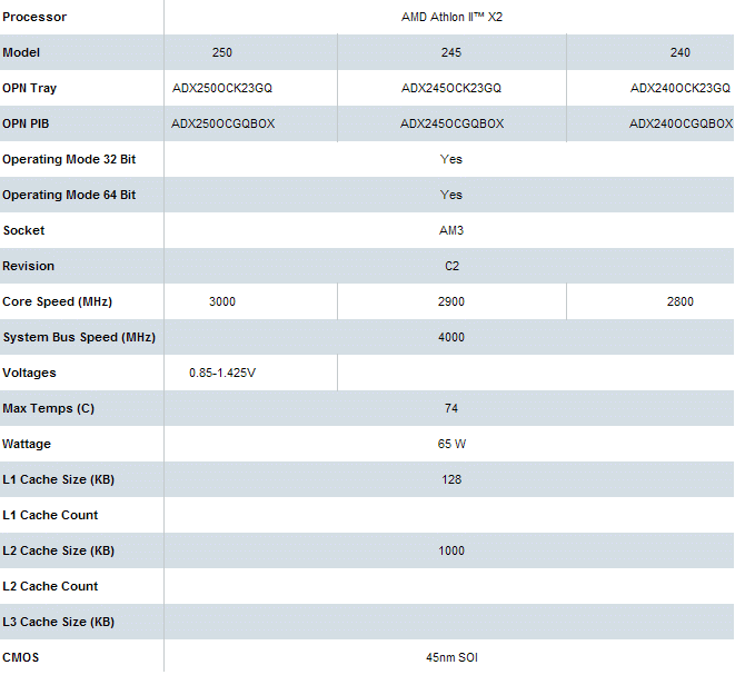 Прайс-лист на официальном сайте AMD на момент публикации новости уже обновился, но датировался 13-ым июля, а в базе данных по характеристикам процессоров все новинки тоже появились. Начнём с новых членов семейства Regor: процессоры Athlon II X2 240 (2.8 ГГц) и Athlon II X2 245 (2.9 ГГц) имеют по 1 Мб кэша второго уровня на каждом из двух ядер. Значение TDP равно 65 Вт, шина HyperTransport 3.0 работает на частоте 4.0 ГГц, конструктивное исполнение Socket AM3 обеспечивает поддержку памяти типа DDR-3.