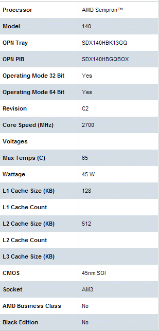 Процессор Sempron 140 (2.7 ГГц) в исполнении Socket AM3, вытеснивший из прайс-листа AMD все прочие одноядерники, предлагается по цене $36. Что любопытно, объём кэша второго уровня равен 512 Кб вместо обещанного 1 Мб, если верить информации с сайта AMD.