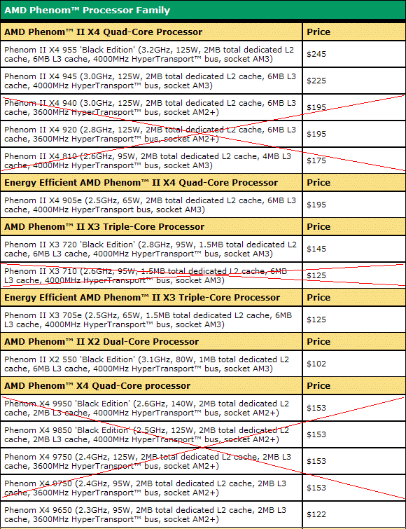 Зачистки в прайс-листе AMD были проведены и среди относительно новых процессоров. Например, исчез четырёхъядерный Phenom II X4 810 (2.6 ГГц) с уменьшенным до 4 Мб объёмом кэша третьего уровня, а также процессоры серии Phenom II X4 9x0 в исполнении Socket AM2+. Ассортимент трёхъядерных процессоров Phenom II X3 7x0 в исполнении Socket AM3 сократился до одной модели со свободным множителем. "Последним из могикан" стал и четырёхъядерный процессор Phenom X4 9650 (2.3 ГГц) в исполнении Socket AM2+. Все прочие процессоры с этим типом разъёма в прайс-листе AMD отныне относятся только к семейству бизнес-решений.