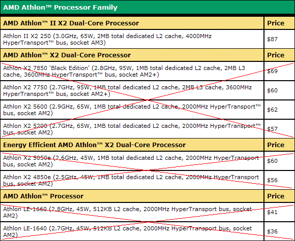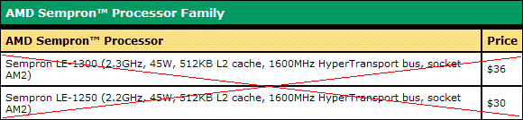 Процессоры Athlon с одним и двумя ядрами в исполнениях Socket AM2 и Socket AM2+ тоже были удалены из прайс-листа AMD, как и процессоры Sempron в исполнении Socket AM2.