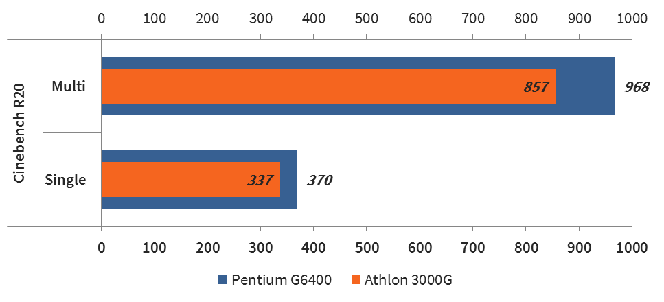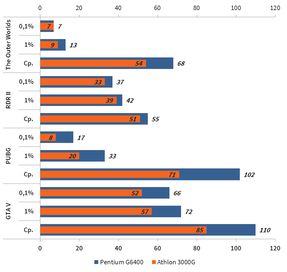 Долгое время в сети отсутствовали какие-либо тесты новинки, но недавно появились первые сравнительные результаты производительности. Автор видео-канала RandomGaminginHD решил сравнить процессоры Pentium Gold G6400 и Athlon 3000G в играх GTA V, PUBG, Red Dead Redemption 2, The Outer Worlds, CS GO и тестовом пакете Cinebench R20. Все игры тестировались при высоких и ультра настройках графики, кроме CS GO, в которой были выставлены низкие настройки. Обе системы использовали 16 ГБ DDR4 памяти с эффективной частотой 2666 МГц и видеокарту NVIDIA GeForce 1080 Ti.