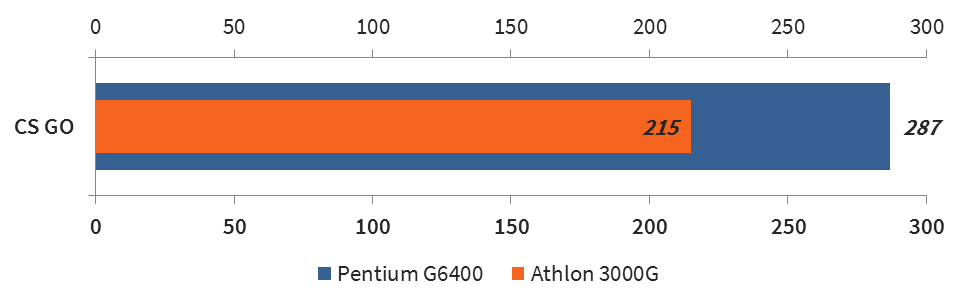 Как и ожидалось, Pentium G6400 во всех тестах оказался быстрее Athlon 3000G за счет более высокой тактовой частоты. По среднему количеству кадров разница может достигать 30%, но Athlon 3000G может быть легко разогнан на материнских платах с чипсетами B-серии, которые также позволяют разогнать и оперативную память. В совокупности это позволит догнать Pentium G6400 и даже перегнать его.