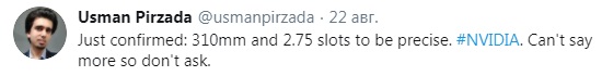 Поставить точку в данном вопросе посредством своего Twitter-аккаунта вызвался главный редактор популярного ресурса Wccftech, в распоряжении которого оказались точные данные касательно габаритов GeForce RTX 3090: по его словам, длина новинки составляет 310 мм, а для её установки потребуется 2,75 слота.