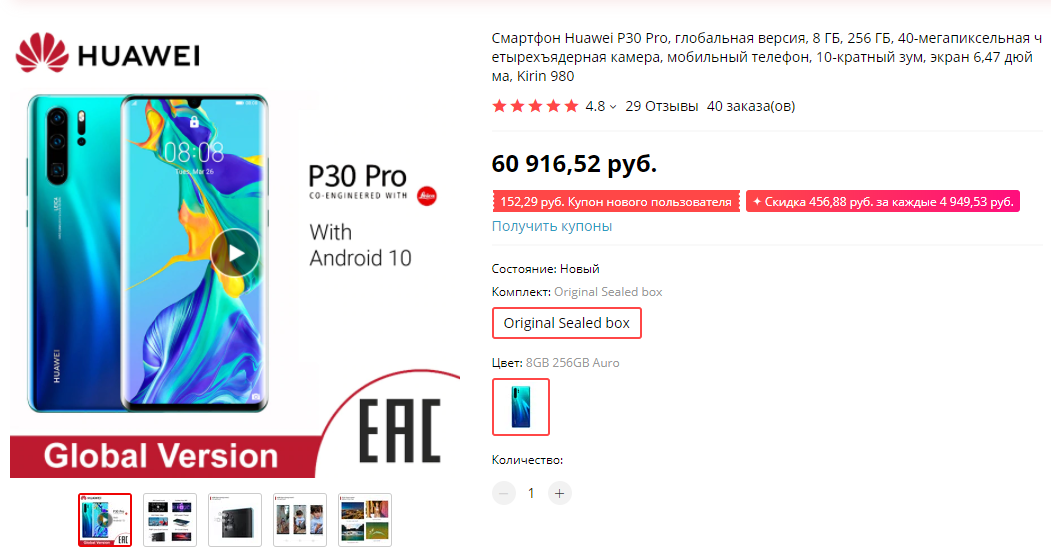 Что до цен на HUAWEI P30 Pro, то далеко ходить не нужно. Сейчас у официального ритейлера на Aliexpress данный аппарат стоит 61 тысячу рублей. Это однозначно много. Особенно, если взглянуть на его цену российском рынке. Здесь наблюдается очень необычная картина, когда у «наших» данный смартфон оказался гораздо дешевле, чем в Китае.