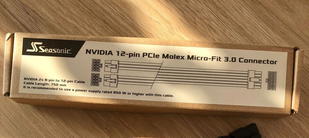 Также на коробке с переходником Seasonic указано, что кабель рекомендуется использовать с блоками питания с выходной мощностью не менее 850 Вт, что может быть не чем иным, как необходимой мощностью блока питания для работы видеокарты RTX 3090.