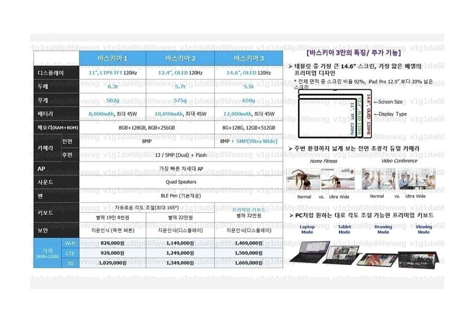 Спереди рамки вокруг экрана более тонкие, а камера располагается внутри выреза на экране. Не исключено, что к моменту начала продаж в дизайне планшета ещё будут изменения. Пока же размеры составляют 325,8 x 207,9 x 5,4 мм при диагонали экрана 14,6 мм. Предположительно, используется панель OLED с разрешением 2 960 x 1848 пикселей и частотой 120 Гц.