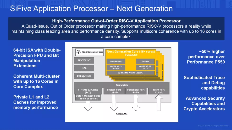 Ядро нового поколения от SiFive для требовательных к производительности приложений основано на микроархитектуре, очень похожей на P550, но с более высокой производительностью на такт. Будущее ядро также будет иметь большие кеши L1 до 128 КБ и L2 до 2 МБ. Кроме того, оно поддерживает многоядерную конфигурацию до 16 ядер с 16 МБ кэш-памяти L3.