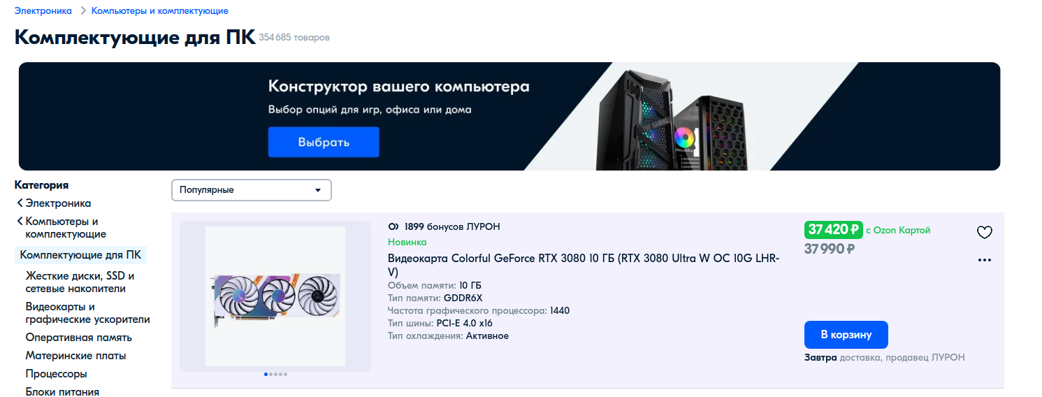 Так в продаже замечена 10-гигабайтная версия RTX 3080 от китайского производителя Colorful (полное наименование — Colorful iGame GeForce RTX 3080 Ultra W OC 10G LHR-V). Стоимость данного экземпляра составляет всего 37420 рублей при оплате "Озон Картой", которую можно открыть бесплатно. Магазин обязуется привезти видеокарту в течение нескольких дней.