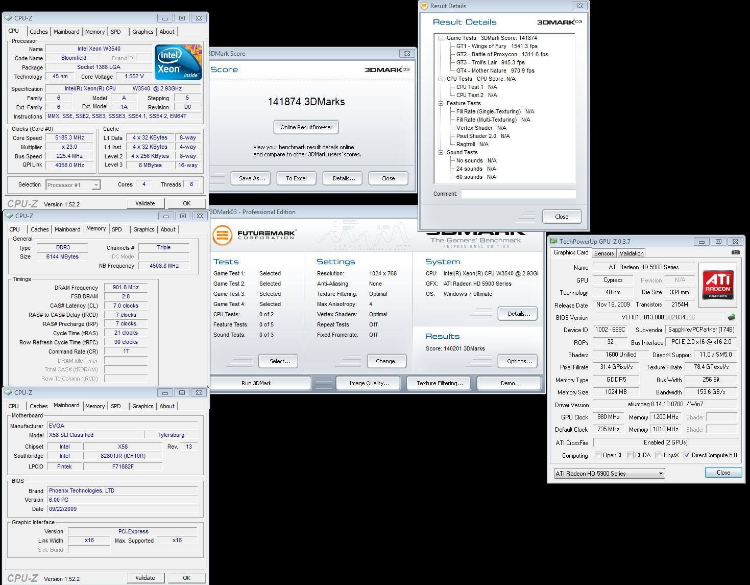 Помимо результатов на одиночных видеокартах, российский оверклокер Nazar отметился и результатами на четырёх Radeon HD 5870 в 3DMark'03. Материнская плата EVGA Classifield 4-way SLI с четырьмя слотами PCI Express x16 и процессор Core i7-950 в связке с четырьмя видеокартами Radeon HD 5870 показали пятый результат в мире в 3DMark'03 - 184 203 балла.