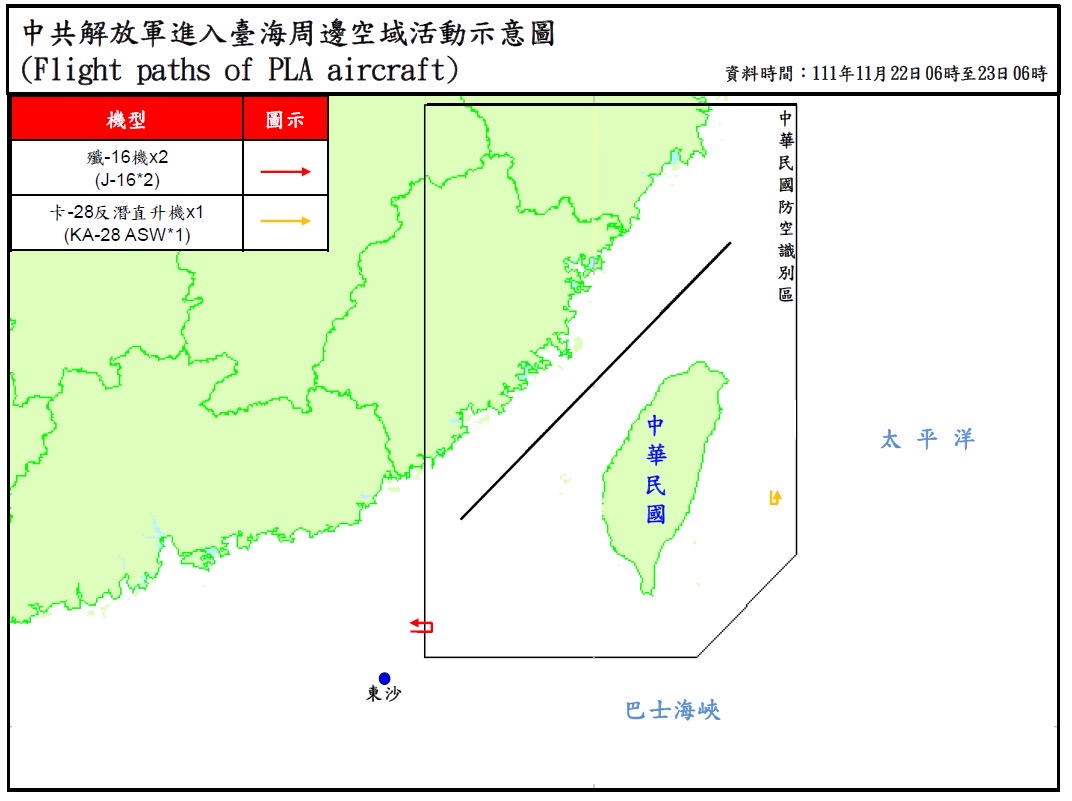Два истребителя J-16 Народно-освободительной армии Китая (НОАК), вылетевшие из Шэньянской военной базы были зарегистрированы в юго-западном секторе идентификационной зоны ПВО Тайваня (ADIZ), по данным MND. Кроме того, в юго-восточном районе ADIZ Тайваня был замечен один противолодочный вертолет Ка-28.