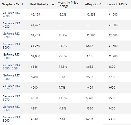 - Средняя цена RTX 4080 на eBay примерно на 30% выше рекомендованной розничной цены, у RTX 4090 на 38% выше рекомендованной розничной цены.