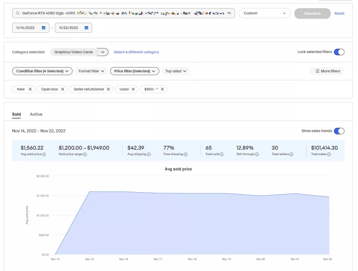 Другие интересные данные, которые можно получить из поиска eBay, показывают, что текущая прибыль от перепродажи RTX 4080 в лучшем случае незначительна. Средняя цена продажи RTX 4080 на eBay в настоящее время составляет 1560 долларов и продолжает снижаться. Для безубыточности (из-за сборов eBay, налогов, доставки и т. д.) перекуп должен был бы купить свою RTX 4080 за 1350 долларов или меньше — сегодня это нетривиальный подвиг.
