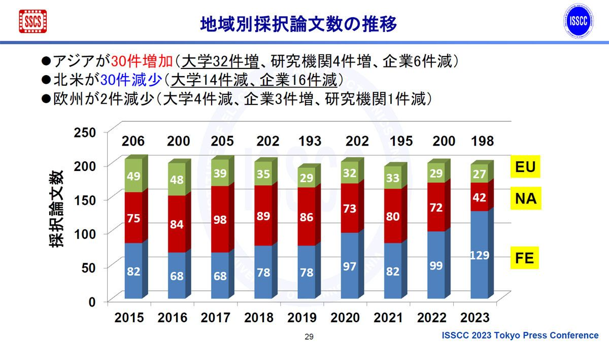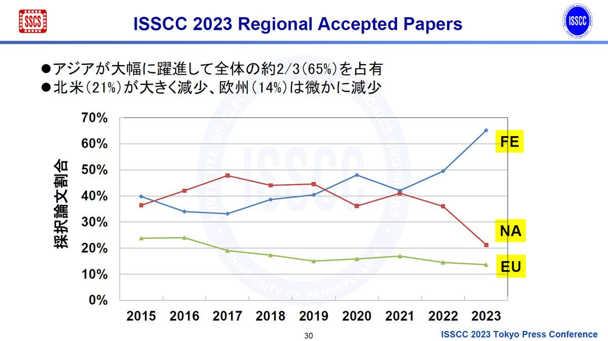 Приняв 59 статей из Китая против 42 из Северной Америки, США больше не могут претендовать на первенство в передовых исследованиях микросхем. Частично эта причина связана с тем, что США представили на ISSCC 2023 на 30 исследовательских работ меньше, чем на предыдущей конференции, в то время как Китай увеличил их количество. Фактически, при 129 принятых статьях из 198, весь Дальневосточный регион, который включает в себя Восточную и Юго-Восточную Азию, в настоящее время имеет почти вдвое больше поданных (и принятых) статей по сравнению с ЕС и США вместе взятыми (27 и 42) соответственно.