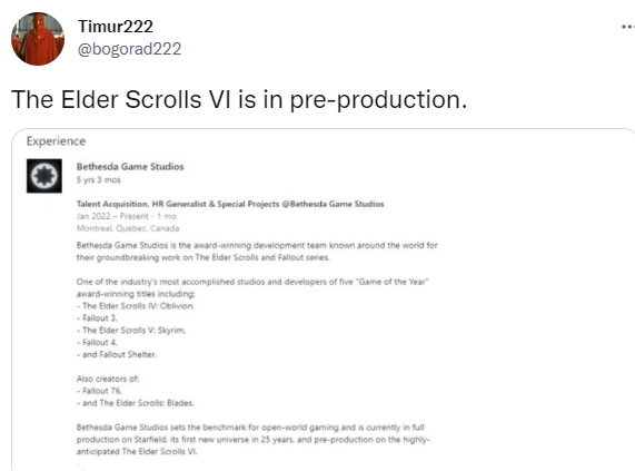 Сегодня в прессу попал документ, опубликованный одним из сотрудников студии Bethesda. Известно, что автором документа выступила женщина по имени Фанни Мансет – специалист отдела кадров отделения Bethesda, физически располагающегося в Монреале. Неясно, зачем Фанни разместила такой важный документ на LinkedIn, но именно там его и нашли интернет-сыщики. Они же сообщают, что ждать анонса The Elder Scrolls VI в 2022 году не приходится, поскольку игра даже не прошла стадию предпроизводства. Это может значить, что у проекта нет чёткого сценария, нет полноценной команды и даже плана, в рамках которого будет проходить разработка. Получается, что кроме нарисованного на коленке тизера, который нам показали ещё в 2018 году, нет вообще ничего.