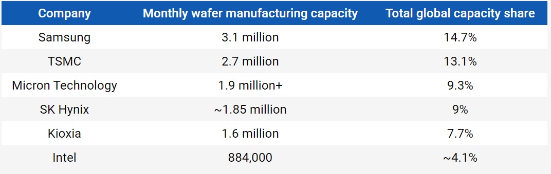 В таблице ниже представлены производящие чипы компании и объёмы ежемесячного производства пластин:
