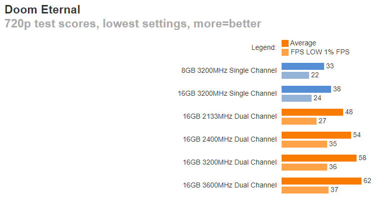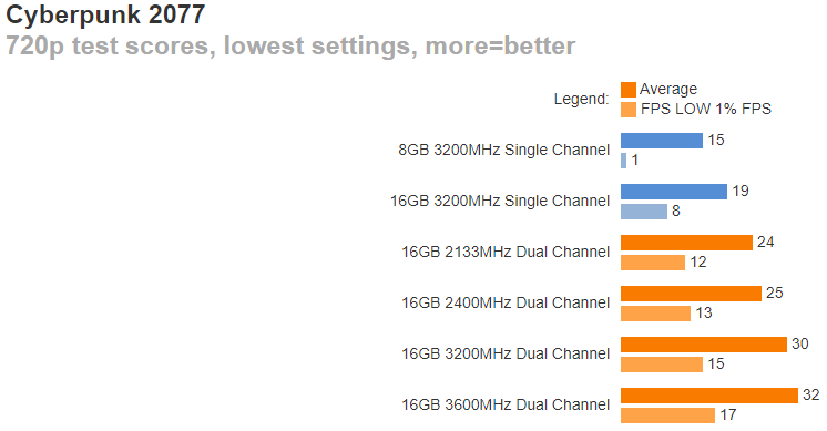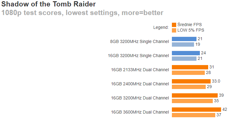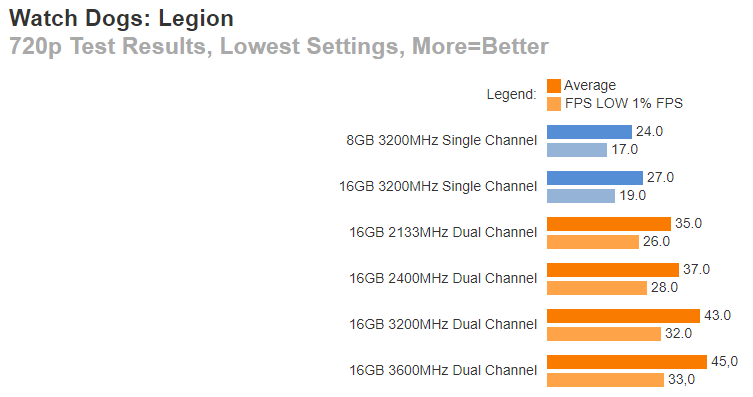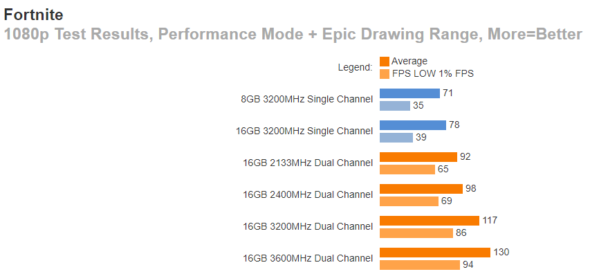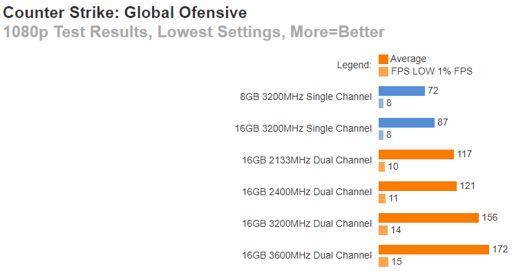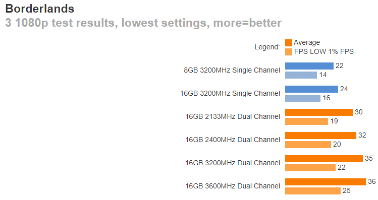 В каких-то играх разрыв не превышает 50%, но во многих переваливает за 70% и доходит до 100%. Это значит, что важно обращать внимание на конфигурацию памяти, ведь две линейки по 8 Гб способны дать вам в двухканальном режиме ощутимый прирост, которого в обычных условиях можно достичь только путём установки дорогой видеокарты. При этом разница в цене между линейками памяти незначительна.
