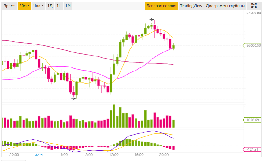 Ну а сама первая криптовалюта на фоне этих новостей смогла наконец-то совершить отскок от уровня поддержки 53 500$ и в моменте достигала цены в 57 000$, что может свидетельствовать об окончании текущей волны коррекции.
