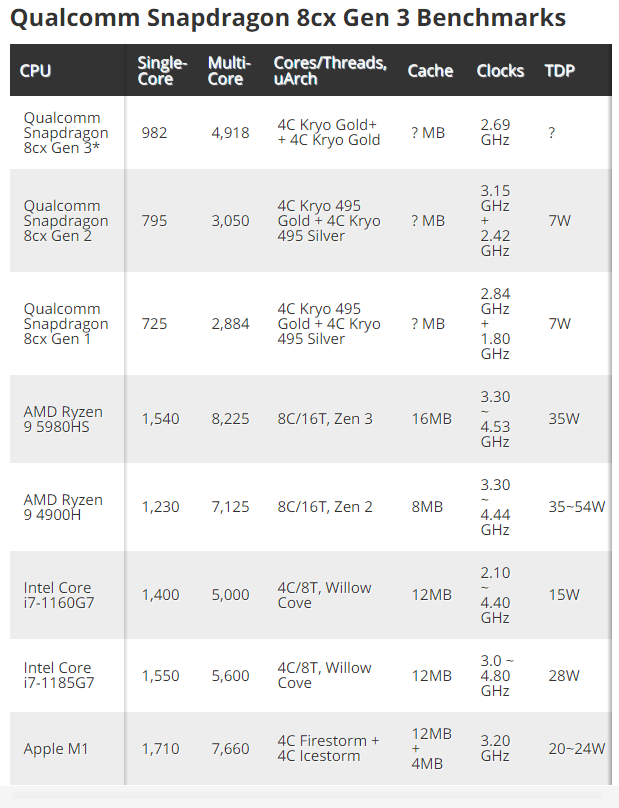 Пока известно, что Snapdragon 8cx Gen 3 в одноядерных тестах на 35% быстрее, чем 8cx Gen 1 и на 24% — чем 8cx Gen 2. Рабочая частота ядер нового чипсета неизвестна, но предполагается, что они производительнее, чем Kryo 495 Gold (кастомная версия ARM Cortex-A76).