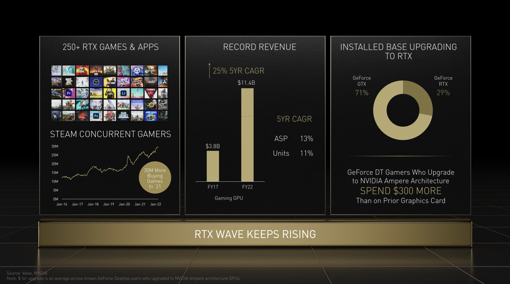 NVIDIA на своем ежегодном дне инвестора объявила, что финансовое положение компании находится в лучшем состоянии, чем когда-либо. И игровое подразделение компании остается крупнейшим источником дохода. В своей презентации NVIDIA пояснила, что геймеры тратят в среднем на 300 долларов больше на продукт Ampere для настольных ПК по сравнению с предыдущими поколениями графических карт. Этот факт, по словам компании, привел к среднему увеличению ASP(средней продажной цены) продукта на 13% в год за последние пять лет.