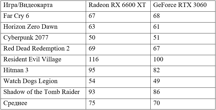 Выше можно увидеть таблицу с результатами. Как видите, в большинстве игр между видеокартами разница остаётся минимальной и только Resident Evil Village увеличивает разрыв, если считать среднее количество кадров по всем играм. Это значит, что в реальной жизни разницу вы не заметите. Стоит учитывать, что блогеры использовали мощный процессор Core i7-12700K, в то время как на каком-то Core i5-8400 отрыв будет и вовсе незаметен.