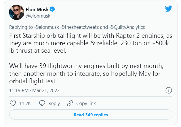 "Первый орбитальный полет Starship будет осуществлен с помощью двигателей Raptor 2, поскольку они гораздо мощнее и надежнее", - написал Маск в Твиттере в понедельник, 21 марта. "К следующему месяцу у нас будет 39 пригодных для полета силовых установок, затем еще месяц на интеграцию, так что, надеюсь, к маю, мы проведем орбитальные летные испытания", - добавил он.