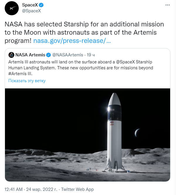 Стоит отметить, что хотя НАСА планирует первые две миссии Artemis осуществить с помощью собственной ракеты-носителя SLS, агентство уже заключило контракт со Starship на отправку первых астронавтов, на Луну с 1972 года. В перспективе с помощью Starship компания планирует отправить людей на Марс.