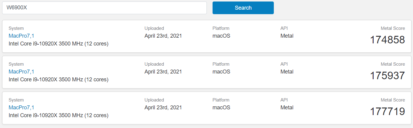 Флагманская видеокарта для рабочих станций AMD Radeon Pro W6900X появилась в Geekbench. W6900X протестировали в macOS 11.4 (Big Sur) на рабочей станции Mac Pro. Похоже, она немного превосходит Radeon RX 6900 XT с результатом 177000 баллов, а 6900 XT набирает около 164000 баллов.