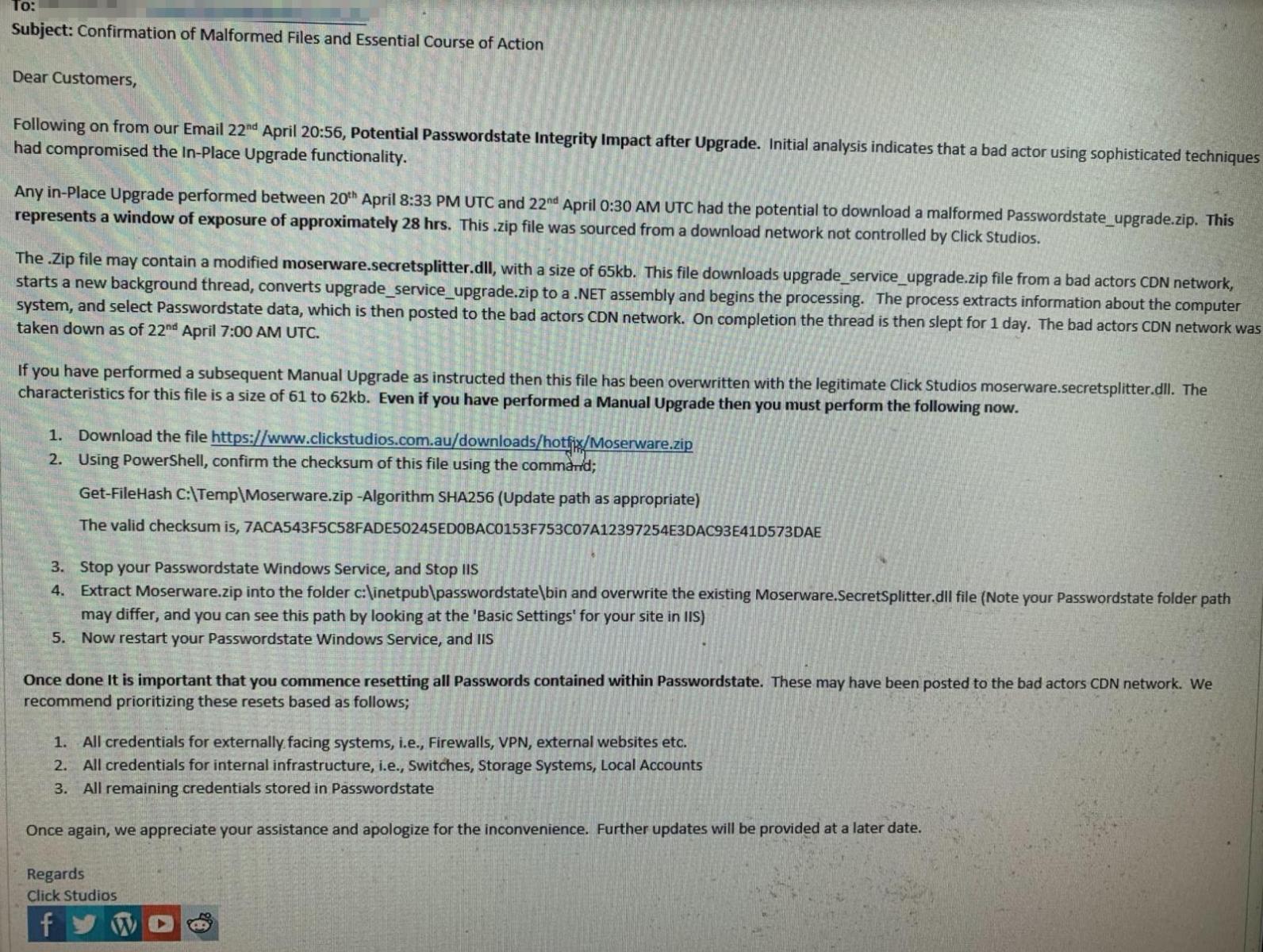 Серверы CDN, использованные в атаке, больше недоступны, так как они были отключены с 22 апреля. Click Studios советует клиентам, которые обновили свой клиент во время взлома, сбросить все пароли в своей базе данных Passworrdstate. Компания также выпустила исправление, чтобы помочь пользователям Passwordstate удалить вредоносное ПО, получившее название Moserware.
