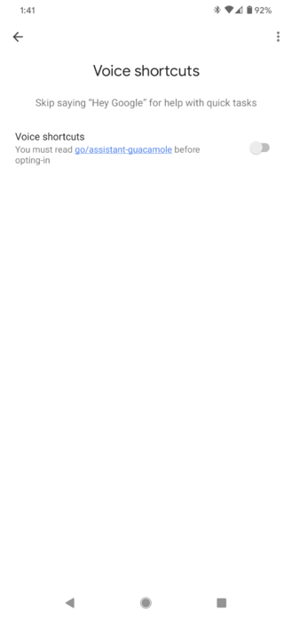 Гуакамоле, похоже, создан на основе голосовых ярлыков, добавляя возможность пропустить обычное «Окей, Google» для «помощи в быстрых задачах», таких как ответ на звонки или отключение сигналов будильника. Когда он будет запущен, вам нужно будет включить эту функцию, прочитав некоторые положения и условия, прежде чем потянуть переключатель. К сожалению, пока не возможно его включить, а URL-адрес, указанный для дополнительной информации о «Гуакамоле», мертв. На данный момент это просто безфункциональный переключатель, среди обычного списка настроек.