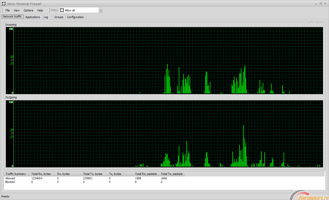 Нельзя сказать, что программа очень дружелюбна к пользователю. В отличие от более раскрученных и в большей степени коммерческих решений, интерфейс Jetico Personal Firewall крайне прост. Он имеет несколько закладок, в которых проводится мониторинг сетевой активности, а также контроль загрузки полосы, а также настройка специальных правил и политик для тех или иных приложений. Неподготовленному обывателю разобраться со всем этим довольно сложно, но на помощь могут прийти мастера по настройке, а также информационные предупреждения с опциями при первом обращении приложений в интернет.