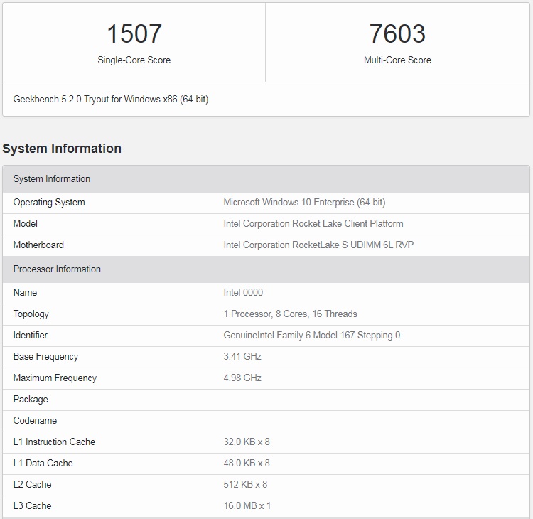 А вот высокие частоты новинок, похоже, никуда не денутся — по крайней мере, об этом говорит находка энтузиаста Leakbench в базе данных популярного тестового пакета Geekbench 5. Согласно имеющимся данным, настольный процессор семейства Rocket Lake-S, оснащённый 8 ядрами/16 потоками, функционировал на базовой частоте ~3.4 ГГц с повышением до ~5 ГГц в максимальном режиме. В однопоточном состязании представленный образец смог набрать 1507 баллов, а в многопоточной дисциплине получил 7603 очка.