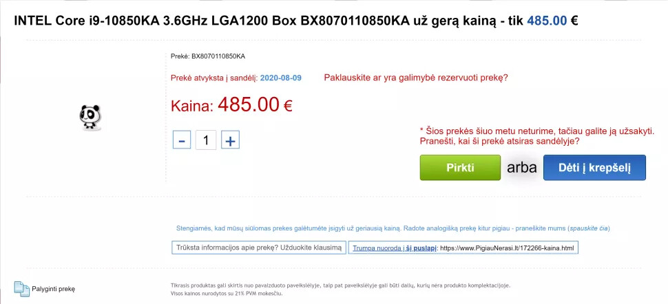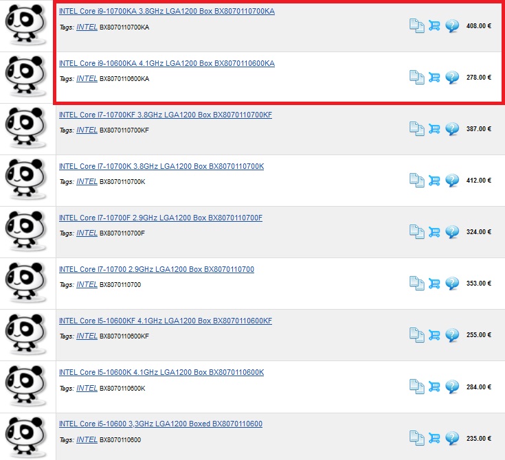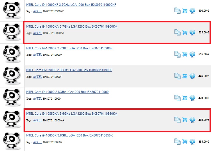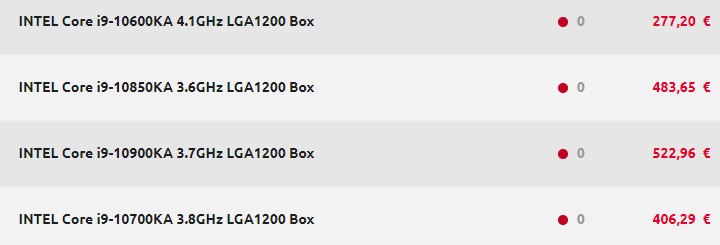 Данные процессоры были размещены на страницах в магазинах Литвы, и цены, в основном соответствуют ценам процессоров Intel F. В список процессоров попали Core i9-10900KA (номер BX8070110900KA) с базовой частотой 3,7 ГГц за 525 евро, Core i9-10850KA (BX8070110850KA) с тактовой частотой 3,6 ГГц за 485 евро, Core i9-10700KA (BX8070110700KA) с тактовой частотой 3,8 ГГц за 408 евро и Core i9-10600KA (X8070110600KA) с базовой частотой 4,1 ГГц за 278 евро. Все процессоры также имеют одинаковый размер кэш памяти L3. Более того наименования процессоров Core i9 на чипах 10700KA и 10600KA выглядит очень странно.