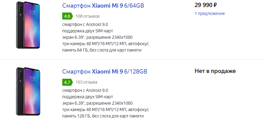 Согласно данным площадки «Яндекс.Маркет», в России сейчас Xiaomi Mi 9 доступен только в модификации с 64 ГБ постоянной памяти по цене 29 990 рублей. Официальная стоимость на старте продаж составила 34 990 рублей. Версия со 128 ГБ хранилища появилась с ценником 37 990 рублей, но уже в наличии её нет.