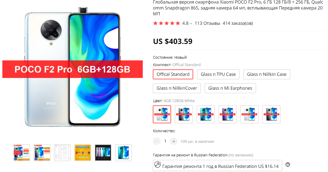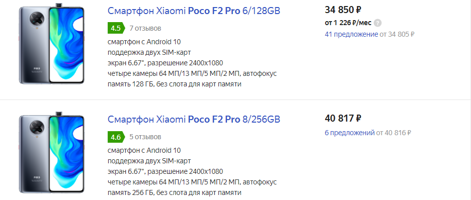 POCO F2 Pro доступен и в более продвинутой модификации. Она предполагает в два раза больше постоянной памяти при 8 ГБ ОЗУ. Рекомендованная стоимость в России составляет 49 990 рублей (700 долларов), но сейчас уже смартфон продаётся за 40 000 рублей (560 долларов). На AliExpress с уже упомянутым промокодом флагман 2020 года обойдётся примерно в 465 долларов.
