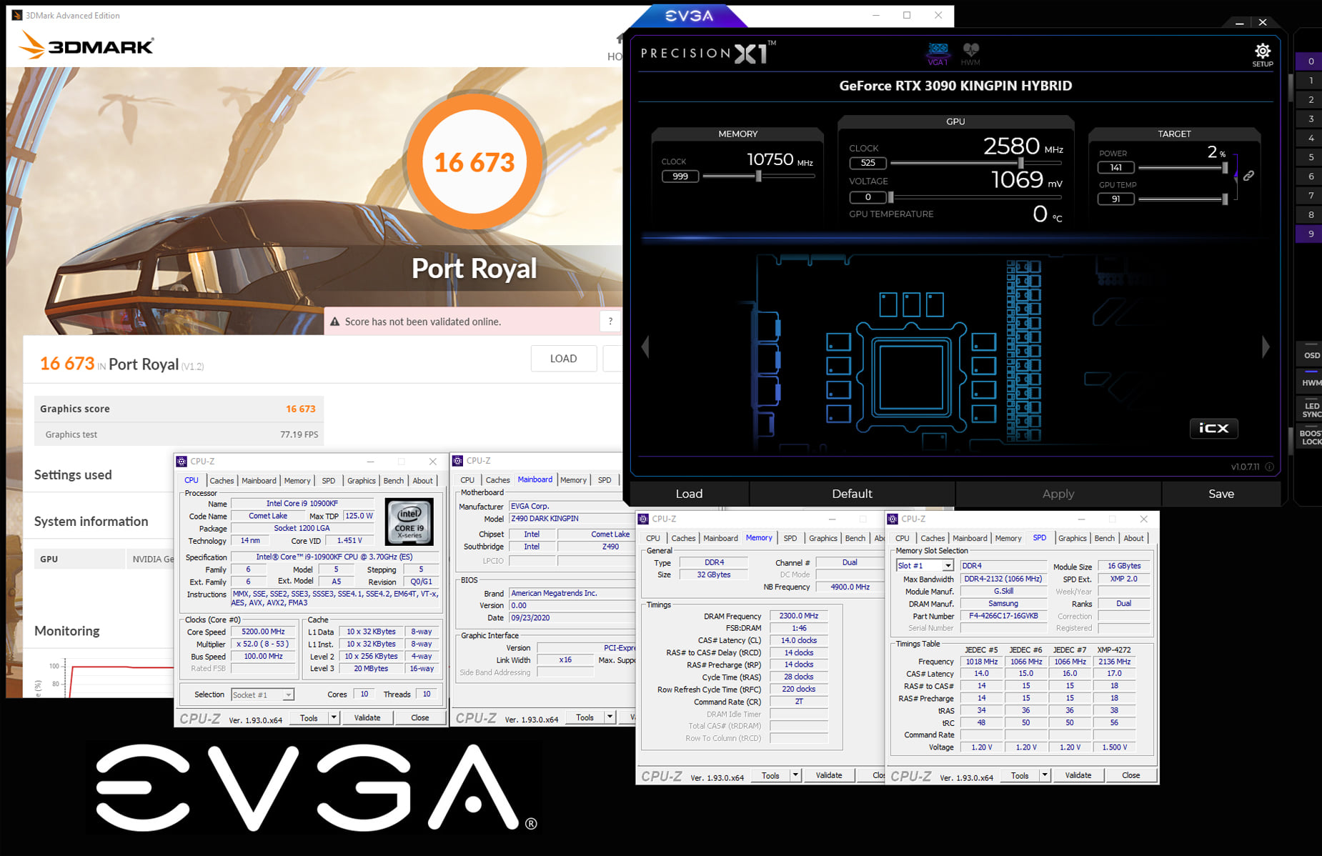 Сегодня в сети появилась информация, что известному оверклокеру KINGPIN (Винс Лучидо) удалось превзойти рекорд мира по производительности в тесте 3DMark Port Royal, используя топовую видеокарту на архитектуре Ampere GeForce RTX 3090 KINGPIN Hybrid производства EVGA.