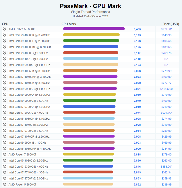 Вчера в тестировании PassMark засветился новый 6-ядерный Ryzen 5 5600X, который с лёгкостью обошёл 10-ядерный Core i9-10900K по показателям одноядерности, где синие традиционно опережали красных многие годы. Если внимательно изучить таблицу, то можно увидеть действительно огромный отрыв. Обратите внимание, что разница в производительности между девятым и десятым поколением (Core i9-9900K и Core i9-10900K) составляет не более 200 баллов. Что же, обычный 6-ядерный камешек Ryzen 5 5600X неожиданно вырвался вперёд на 300 баллов.