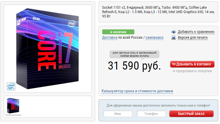Стоит отметить, что данный камень отлично разгоняется, а значит при неплохом охлаждении есть шанс получить гораздо выше 5 ГГц. Поскольку сеть американская, купить данный чип можно только находятся в США. Давайте назовём это тренировкой того, что случится на отечественном рынке с выходом новеньких камешков от AMD. Ну а если вам не терпится купить Core i7-9700K сегодня, то в Регарде он стоит 31 590 рублей. Здесь вам и быстрая доставка, и в Америку ехать не надо.