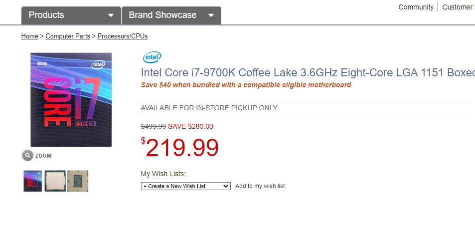 Что же, это отличный повод распродать складские запасы. Сегодня в американской сети магазинов Micro Center большие скидки. Скажем откровенно, такого ещё не было никогда. Только посмотрите: Core i7-9700K можно получить всего за 219 долларов, а ведь перед нами настоящий игровой чемпион, тактовые частоты которого замерли в шаге от 5 ГГц и находятся на уровне 4.9 ГГц.