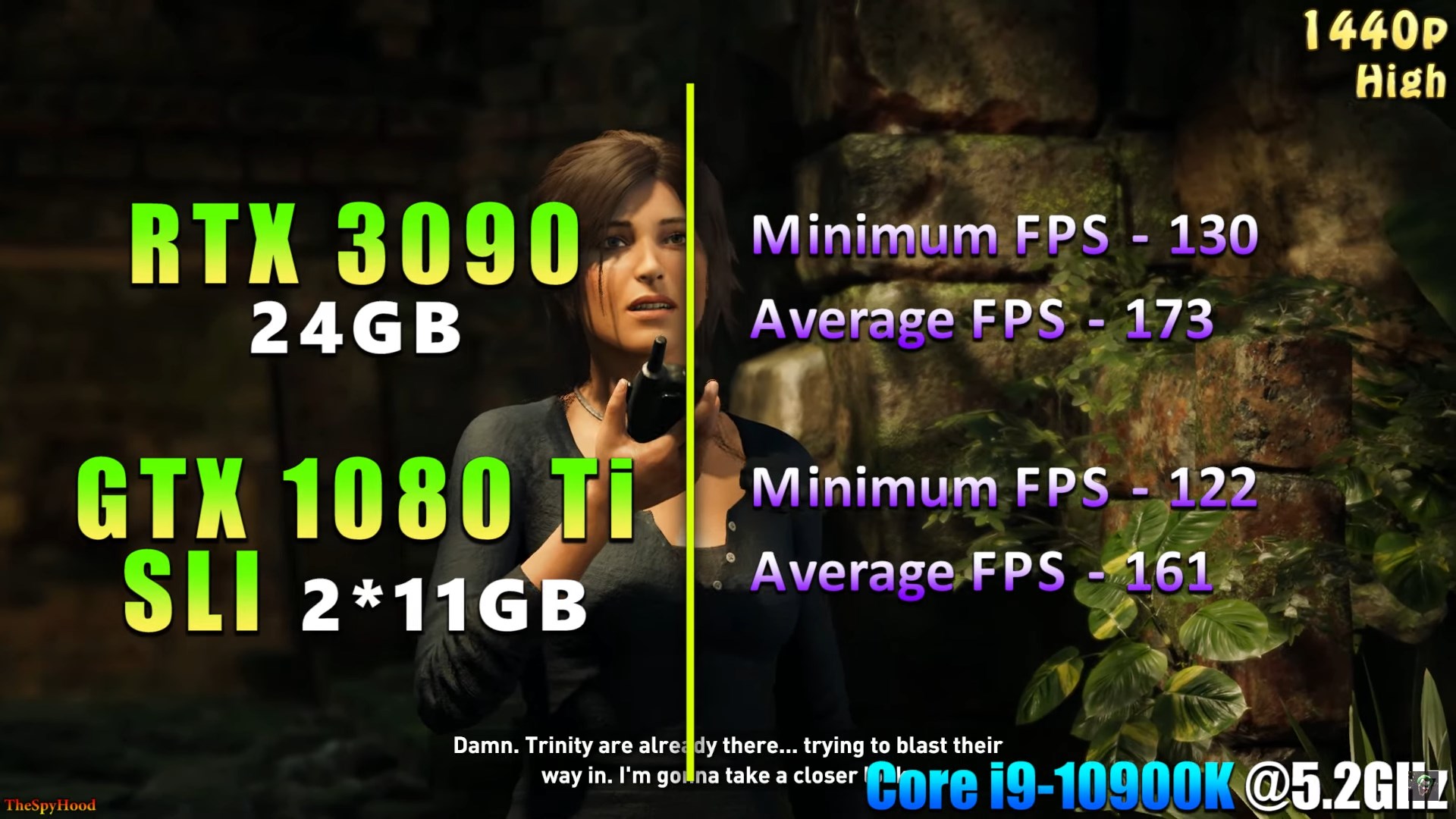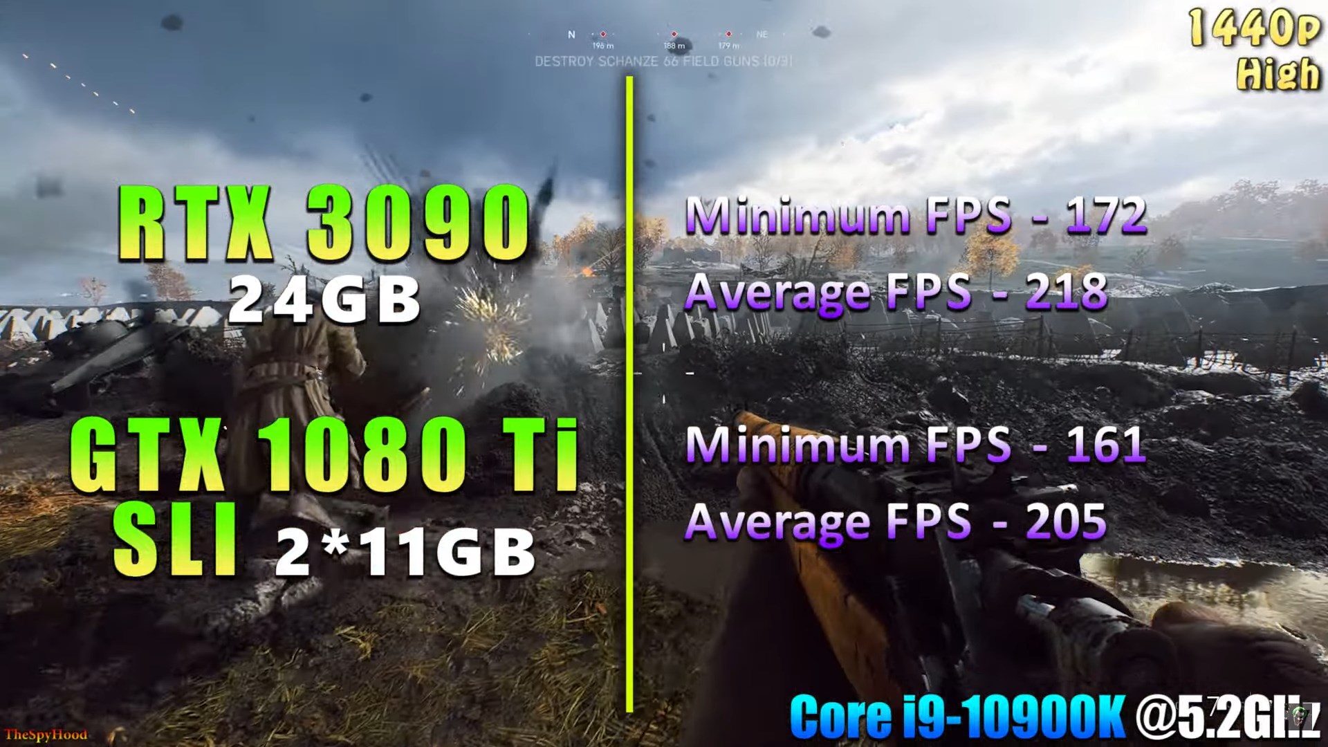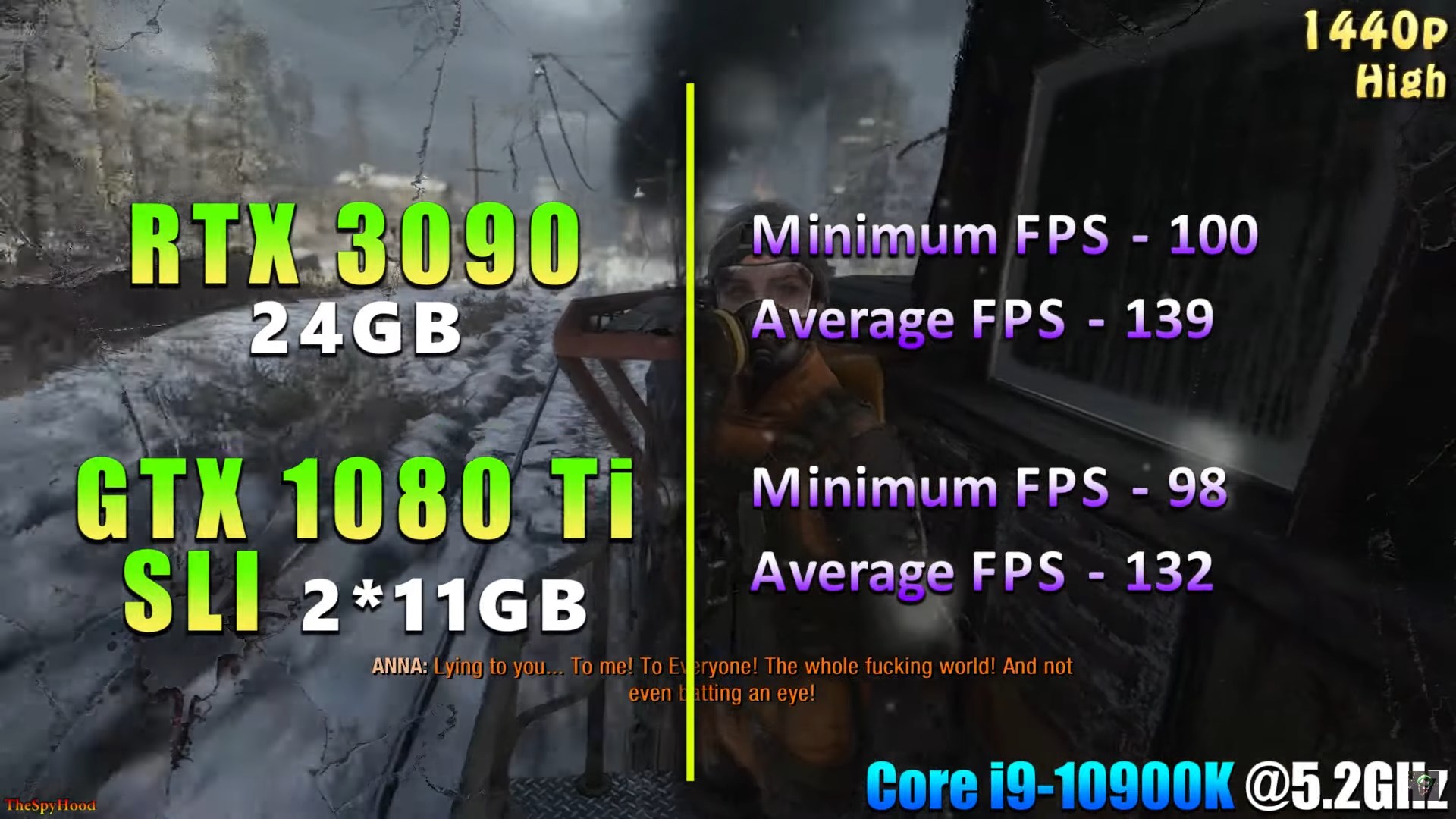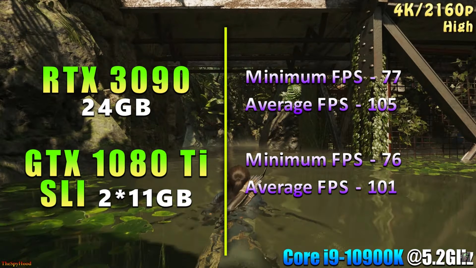 Но с тех пор успело выйти ещё одно поколение видеокарт от Nvidia и уже другой энтузиаст с канала TheSpyHood решил сравнить возможности связки из двух GTX 1080 Ti с производительностью флагманской RTX 3090. И оказалось, что два топовых Паскаля почти не отстают от самого мощного Ампера. В большинстве протестированных игр RTX 3090 оказалась быстрее на 5-15%, а вот её цена превосходит стоимость двух 1080 Ti с вторичного рынка в 2 с лишним раза. Цифры FPS в тестах довольно близки к результатам Технокухни. Разве что последние не проводили тестирования в 4К.