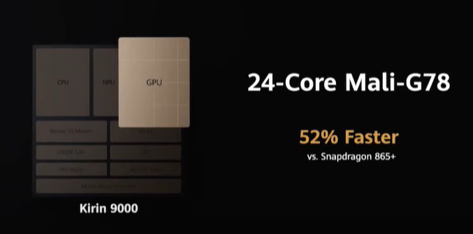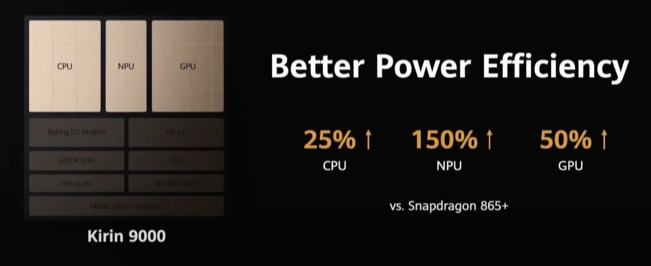 В сравнении с конкурентами делается упор на Qualcomm Snapdragon 865+. Huawei заявляет, что прирост по отношению к конкуренту составляет для CPU, GPU, NPU - 25, 50 и 150 процентов соответственно.