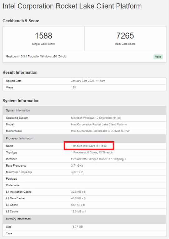 В базе данных программного обеспечения Geekbench 5 появилась информация о прохождении теста на производительность персональным компьютером на настольном процессоре Intel Core i5-11500. Как оказалось, 6-ядерный 12-поточный чип превзошёл в однопоточном режиме показатель 8-ядерной 16-поточной платформы Intel Core i7-11700K.